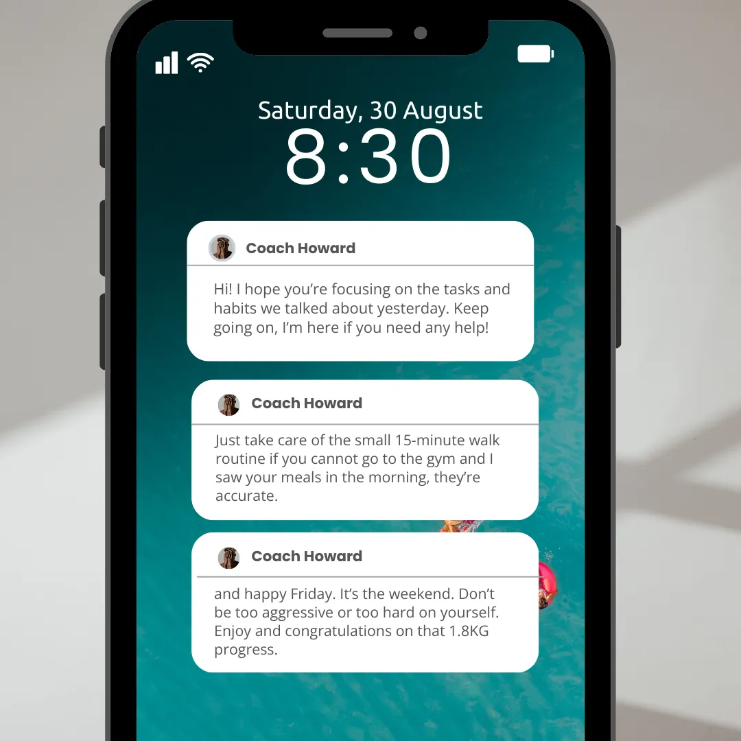 This is not a workout plan or a meal plan you follow alone. It’s a coach-led lifestyle reset built around your schedule, food preferences, and habits. You get real accountability, weekly check-ins, daily guidance, and adjustments as life happens — not a static PDF or app-only experience.